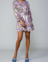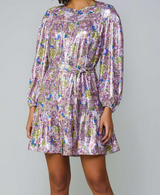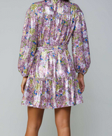 LONG SLEEVE FLORAL FOIL FABRIC ONE-TIERED SKIRT CREW NECK DRESS WITH SELF-TIE GATHERED YORK SHOULDER DETAIL