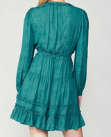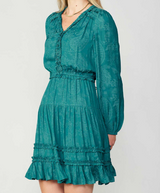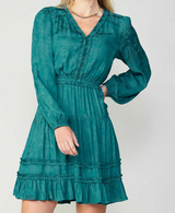 LONG-SLEEVE SPLIT NECK ELASTICIZED WASIT&CUFFS MINI DRESS WITH RUFFLED DETAIL ON NECK&SHOULDER&HEM&WAIST - TEAL