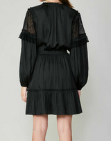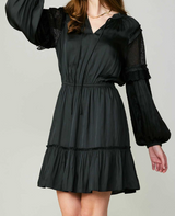 LONG-SLEEVE SPLIT NECK MINI DRESS WITH SELF TIE & RUFFLE DETAIL ON SHOULDER/SLEEVE/SKIRT WITH LACE CONTRAST ON SLEEVE - BLACK
