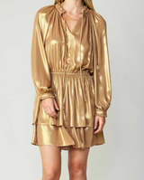 LONG-SLEEVE SPLIT NECK WITH RUFFLE NECK&CUFFS DETAIL TIERED MINI DRESS - GOLD