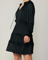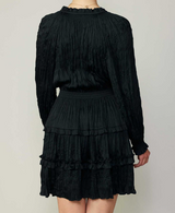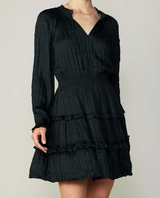 LONG-SLEEVE WRINKLED MINI DRESS WITH SPLIT NECK - BLACK