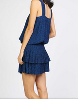 SLEEVELESS SQUARED BUTTONED NECK ELASTIC WAISTED TIERED MINI DRESS WITH SMOCKING, PLEAT, AND PIN-TUCK DETAIL - MIDNIGHT NAVY