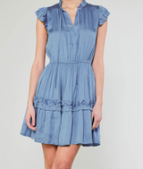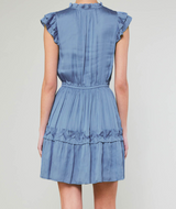 FLUTTER SHORT SLEEVE RUFFLED SPLIT NECK DRESS WITH SELF NECK TIE & ELASTICIZED WAIST - DEEP PERIWINKLE