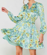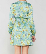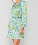 LONG-SLEEVE SPLIT NECK WITH SELF-TIE SHORT DRESS WITH RUFFLED DETAIL ON NECK & SKIRT / ELASTICIZED WAIST & CUFFS - MLT FLORAL