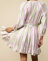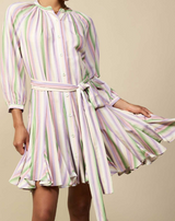 3 QUARTER SLEEVE ROUND NECK BUTTON DOWN GODET MINI DRESS WITH SELF TIE BELT - PASTEL MLT