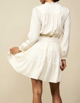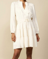 LONG SLEEVE RUFFLED SPLIT NECK ABOVE KNEE DRESS WITH ELASTICIZED WAIST AND THREE TIERED SKIRT - IVORY