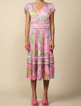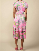 MULTI FLORAL PRINT V NECK PLEATED SHORT SLEEVE RUFFLE MIDI LENGTH DRESS - PINK MLT