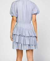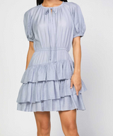 PANELED SHORT SLEEVE SPLIT NECK ELASITC WAISTED ASYMMETRICAL RUFFLED MINI DRESS WITH SELF NECK TIE - LIGHT GREY