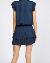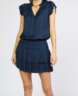 SHORT SLEEVE MINI DRESS WITH SPLIT NECK WITH TIE, SMOCKED WAIST, AND PLEATED SKIRT - DARK NAVY