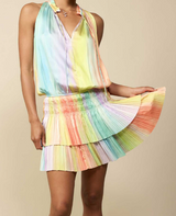 SLEEVELESS SPLIT RUFFLED NECK WITH TIE MINI DRESS AND PLEATED TIERED SKIRT - RAINBOW