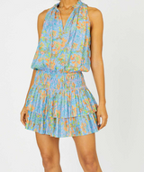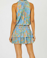 SLEEVELESS SPLIT RUFFLED NECK WITH TIE MINI DRESS WITH PLEATED TIERED SKIRT - Blue & Orange