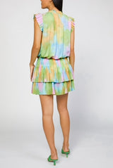 SPLIT RUFFLED NECK WITH TIE MINI DRESS AND PLEATED TIERED SKIRT - RAINBOW