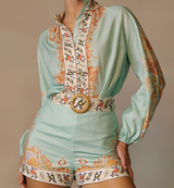 High Neck and Long Sleeve Button Down Paisley Boarder Print Blouse